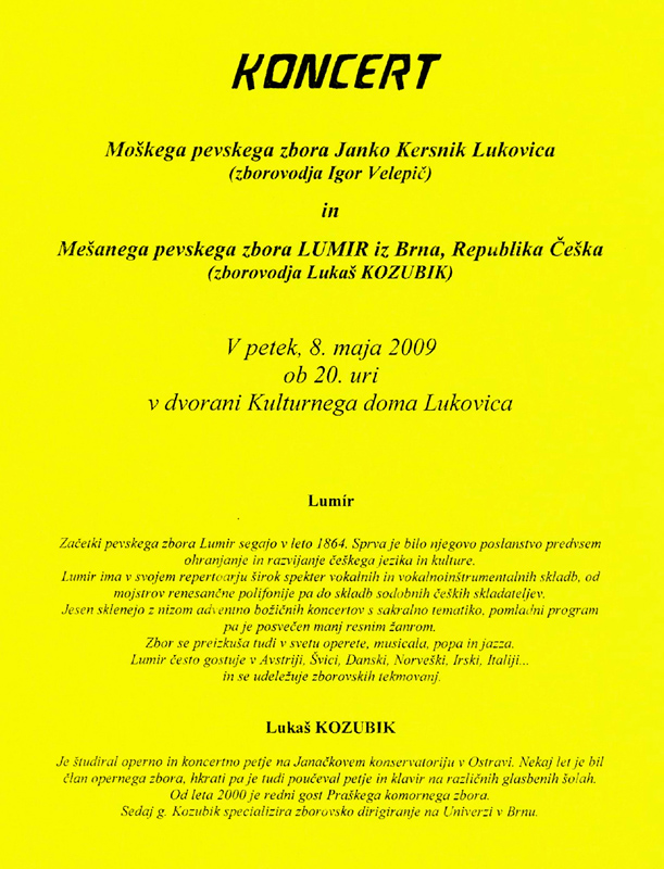 O víkendu 13. a 14. června 2009 jsme uvítali v Brně spřátelený sbor Gaudium z Komárna (Slovensko). Návštěva vyvrcholila v neděli 14. června společným výletem do Moravského krasu, obědem v obci Sloup a tradičním jarním koncertem ve Sloupsko-šošůvských jeskyních. Sbor Gaudium do svého programu zařadil B. Smetanu, maďarské autory Zoltána Kodályho, Lajose Bárdose, dále E. Suchoně a další, náš sbor Lumír přidal spirituál Swing low a dvě skladby od Rihardse Dubry.