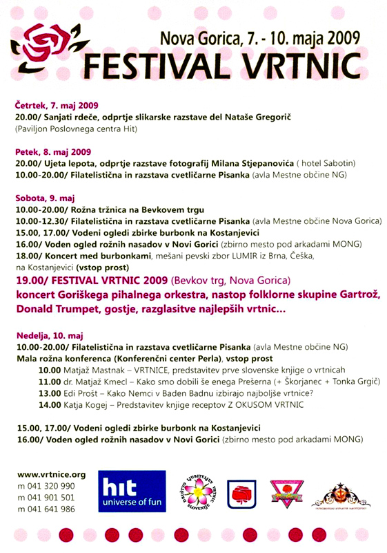 Letos jsme podnikli další zahraniční zájezd, tentokrát do Slovinska, kde jsme vystupovali poprvé 8. května v kulturním domě v obci Lukovica na pozvání sboru „Janko Kersnik“ Jeho sbormistr Igor Velepič se posléze stal naším průvodcem nejen po Ljublani. Druhý koncert 9. května v Nové Gorici se netradičně odehrál v zahradě plné růží (proto také festival, na němž jsme hostovali, dostal jméno „Festival vrtnic“ neboli česky „Festival růží“) s výhledem na místní vinice, jejichž lahodné produkty jsme měli následně možnost ještě několikrát ochutnat. Po splnění pracovní části programu zbyl čas i na koupání v moři u Piranu (již poblíž italského území), prohlídku Ljublaně, Tolminu i Triglavského národního parku, stejně tak k překonání sebe sama jízdou na raftu po divoké řece Soče poblíž centra Žiga. Více fotografií z cest nabízíme ve fotogalerii.