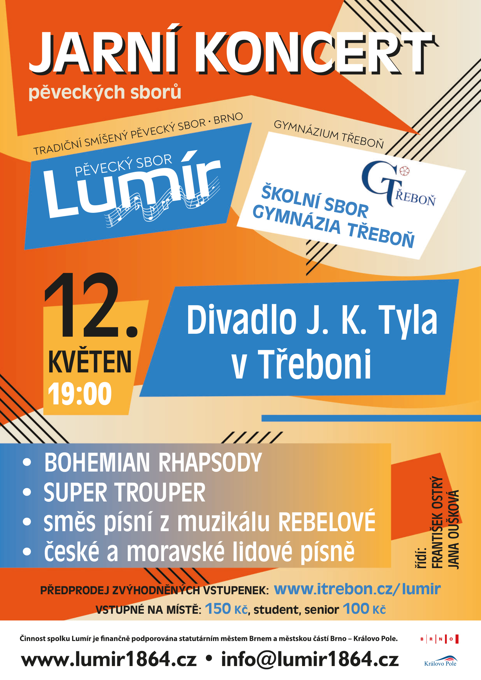 V pátek 12. 5. od 19 h. si zazpíváme v třeboňském divadle J. K. Tyla spolu se sborem místního gymnázia. Prostory vypadají honosně a již se moc těšíme. Vstupenky lze zajistit předem online na webu www.itrebon.cz/Lumir nebo osobně v Třeboni v Turistickém informačním centru města na Masarykově nám., v Lázních Aurora, Bertiných Lázních a v kině Světozor; v Českých Budějovicích pak také v Turistickém informačním centru na nám. Přemysla Otakara II.
