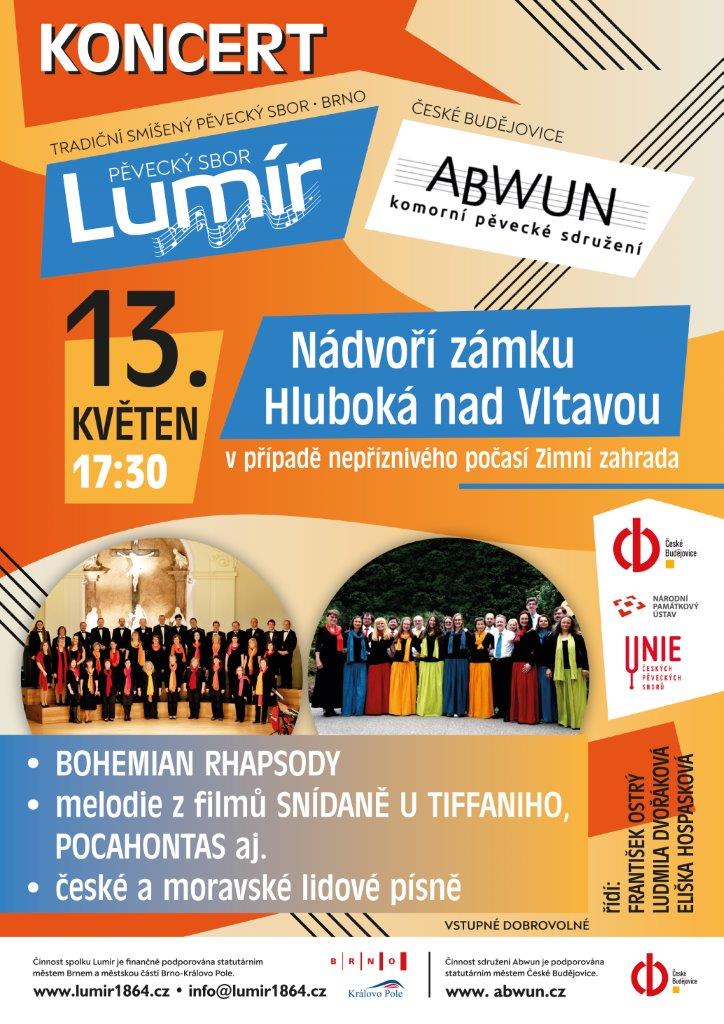 V sobotu 13. května od 17,30 (po poslední prohlídce) vystoupíme na nádvoří romantického zámku Hluboká nad Vltavou spolu s komorním pěveckým sdružením Abwun z Českých Budějovic. Zde je vstupné dobrovolné.