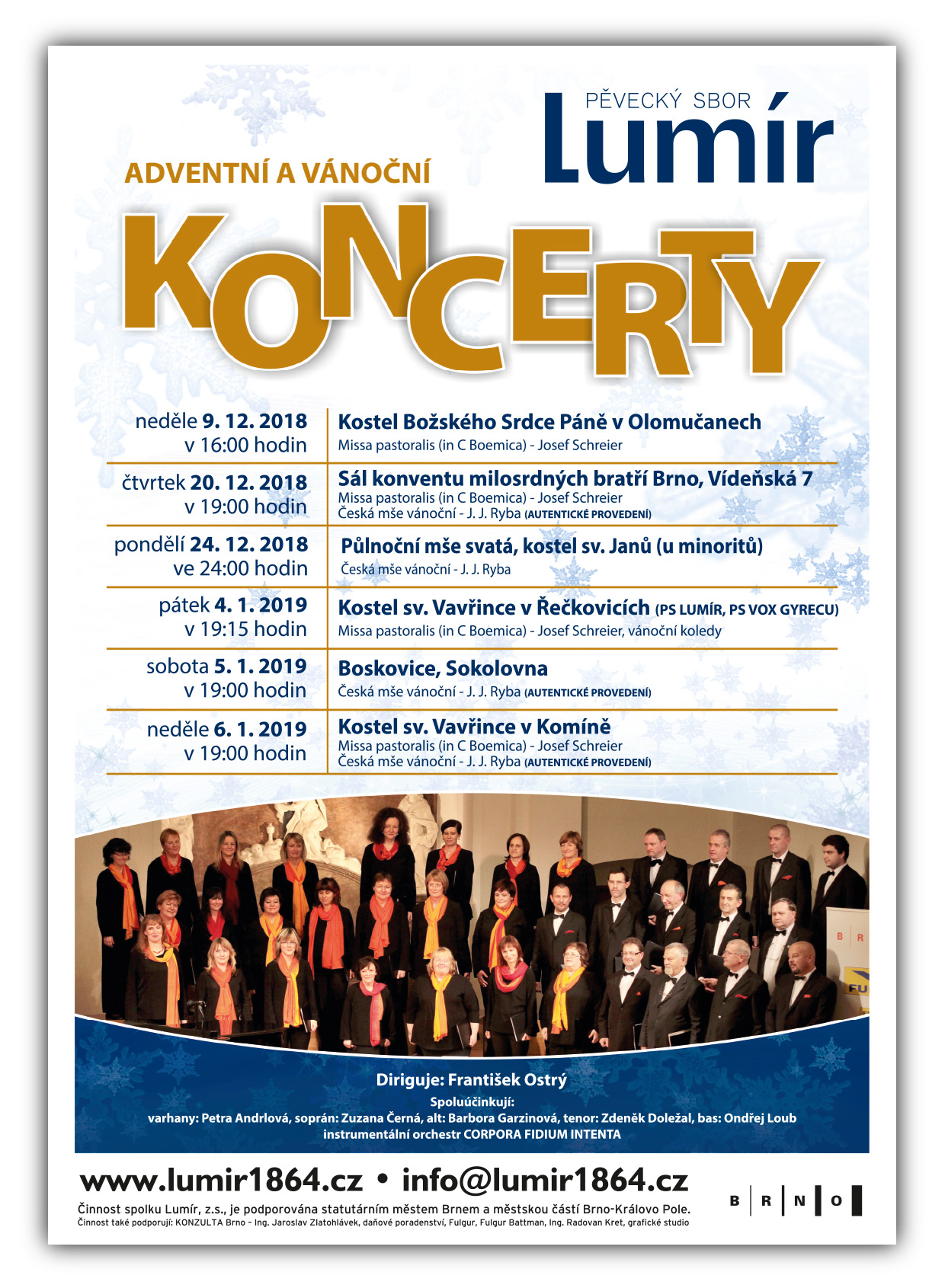 Podzim už se chýlí ke konci a pěvecký sbor Lumír Vás zve na svá prosincová a lednová vystoupení. Na programu jsou letos dvě mše: známá a oblíbená Rybova Česká mše vánoční avšak v autentickém (původním) provedení a také její "předchůdkyně" Missa pastoralis (in C Boemica) od Josefa Schreiera.